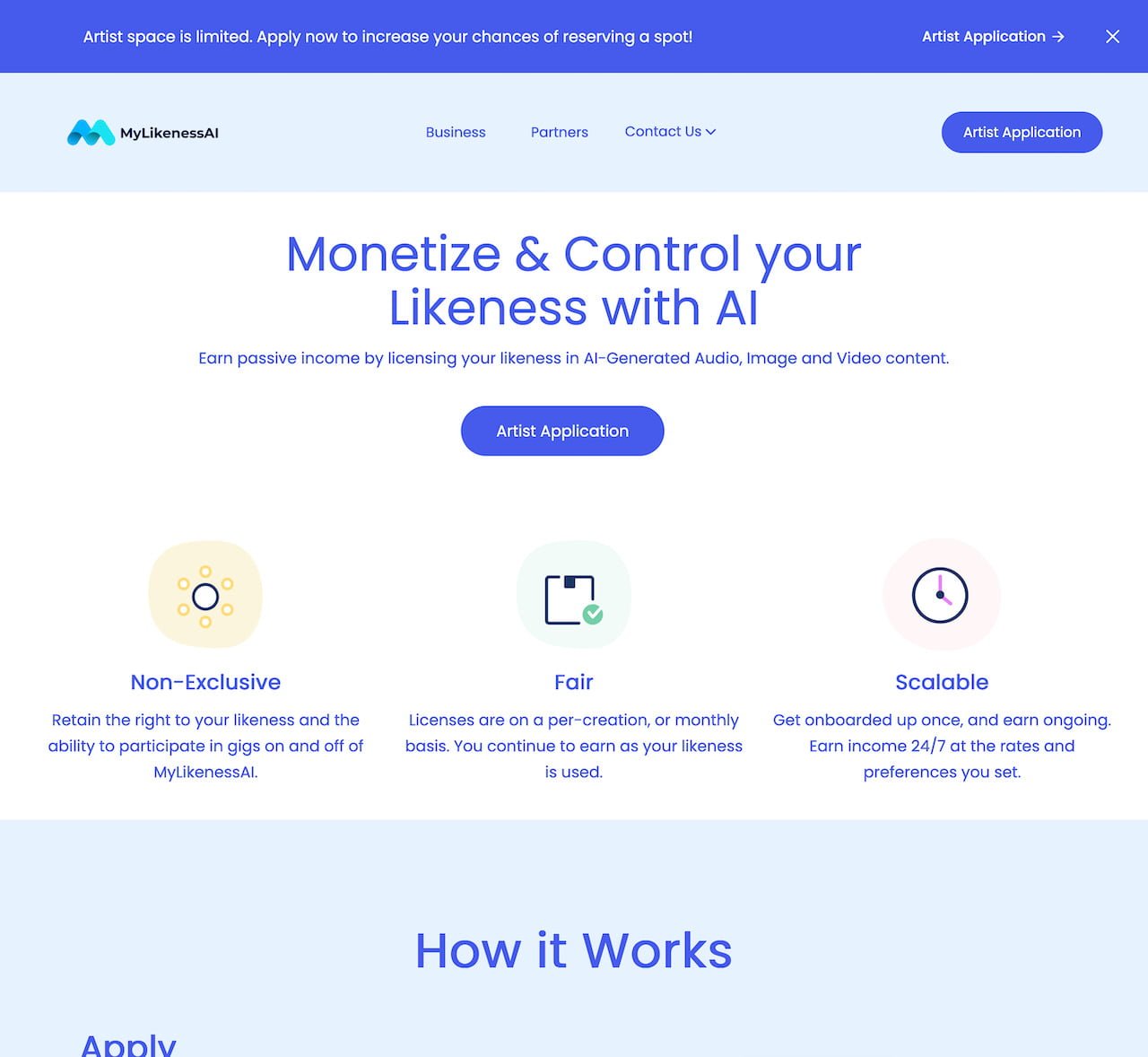 likeness licensing platform for generative AI that enables artists to monetize and control their likeness in AI-generated content. Generative AI companies can integrate the engine for free, while businesses gain confidence in using AI likenesses commercially with proper licensing and legal protection.