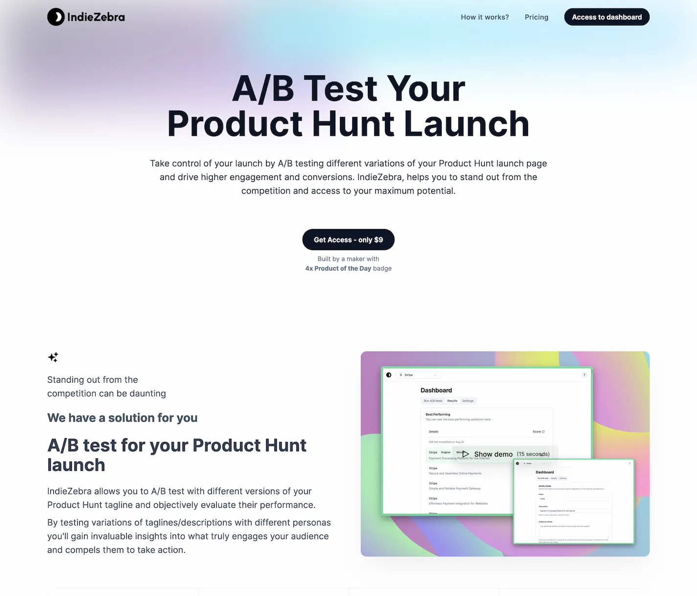 IndieZebra is a dedicated platform that facilitates the optimization of Product Hunt launches via A/B testing.